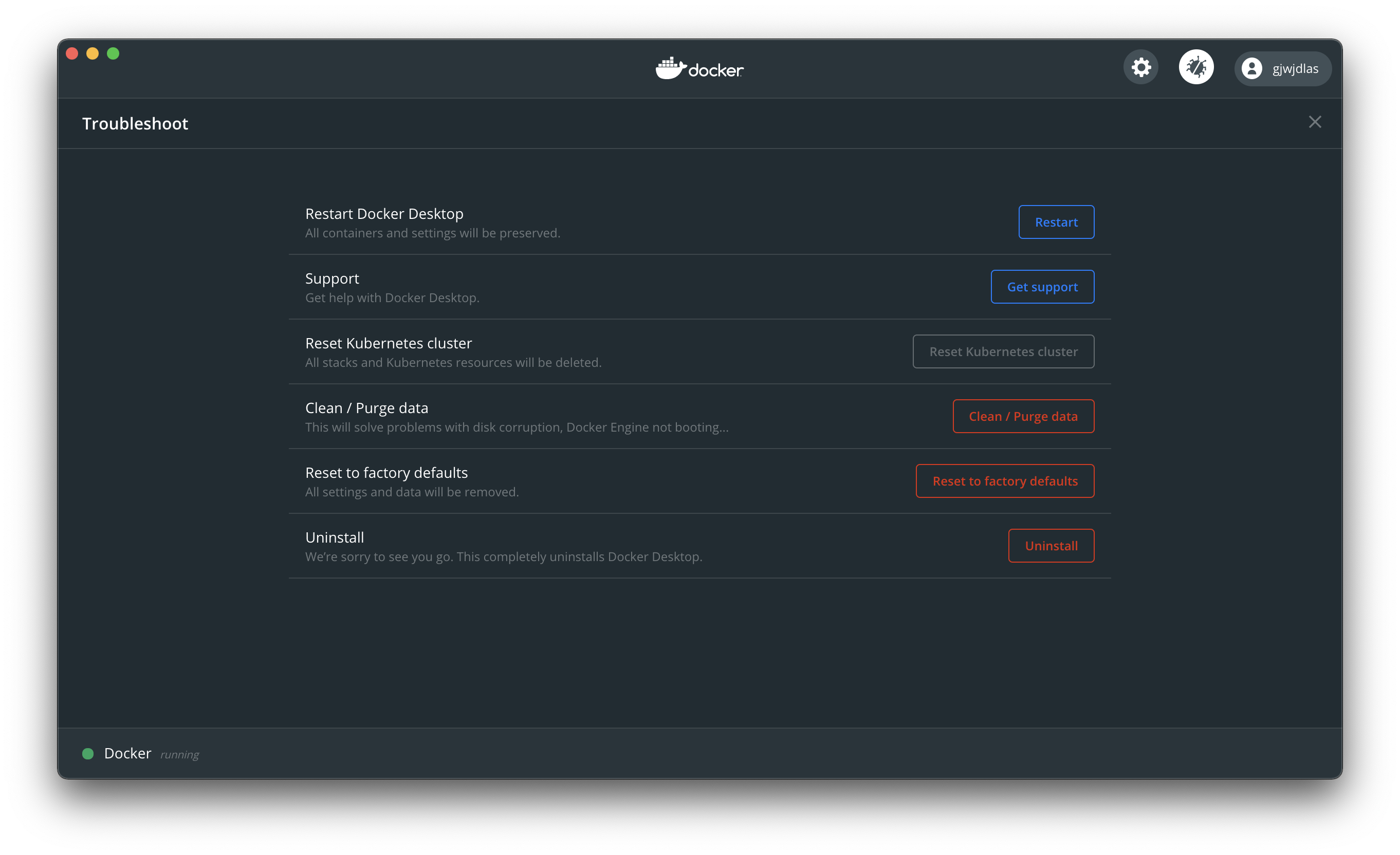 ๊ทธ๋์ ์ฐพ์ ๋ค๋ฅธ ๋ฐฉ๋ฒ์ ์์ ํ๊ฒฝ์ ์ฒ์์ผ๋ก ๋๋๋ฆฌ๋ ๋ฐฉ์์ ๋๋ค. docker ์ดํ๋ฆฌ์ผ์ด์ ์ ๋ค์ด๊ฐ์ ์ค์ ์ ๋ฒ๋ ๋ชจ์ ์์ด์ฝ์ ๋๋ฅธ ๋ค, "Reset to factory defaults"๋ฅผ ๋๋ฌ์ฃผ๋ฉด ์ด์ ์ฒ๋ผ ์์๊ฒ ๋น๋ํ ์ ์์ต๋๋ค.