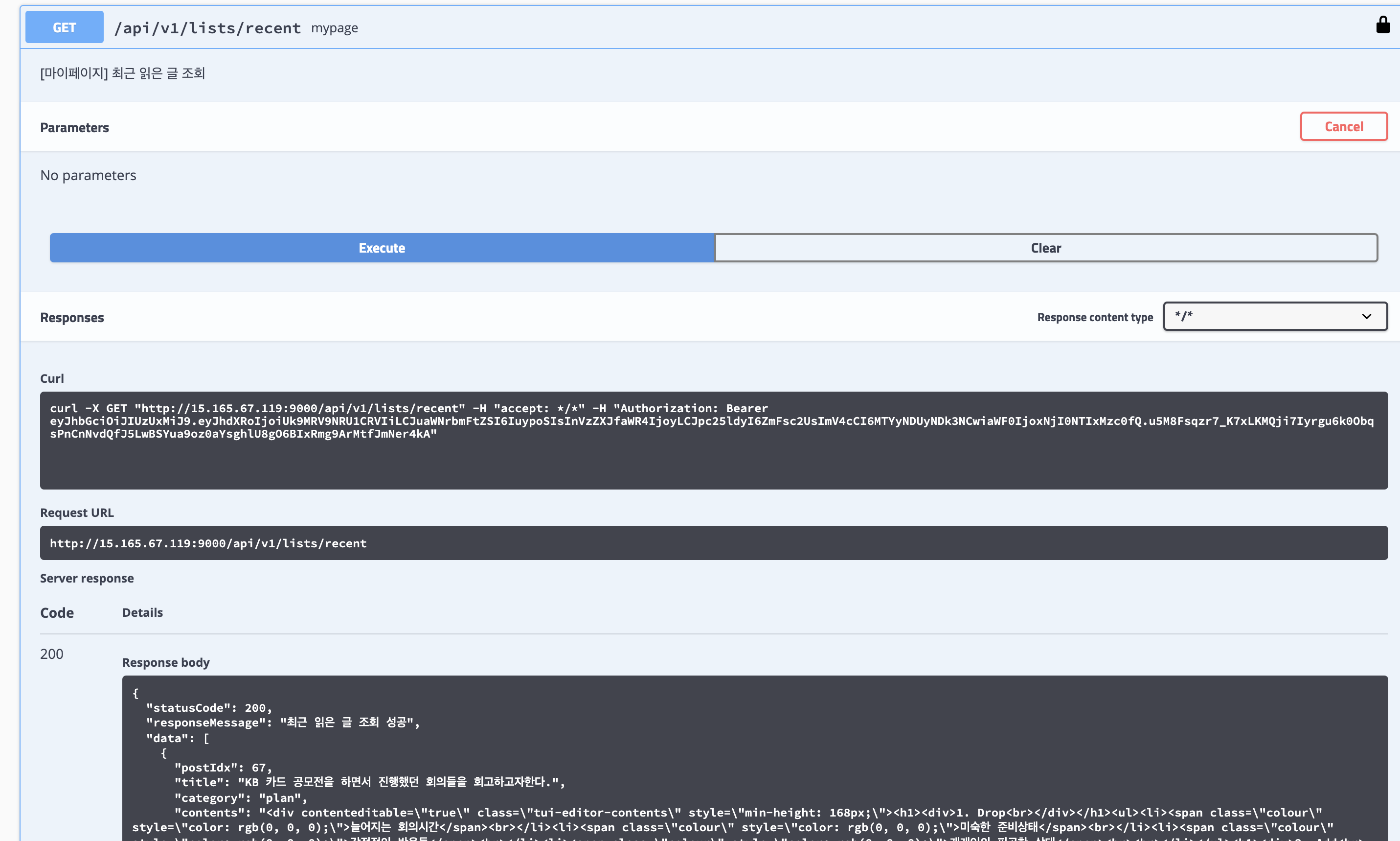 swagger์์ ํ ์คํธํด๋ณด๊ฒ ์ต๋๋ค. ํ์ฌ userIdx๋ accessToken์์ ๋ฐ๊ณ ์๊ธฐ ๋๋ฌธ์ ๋ฐ๋ก ๋๊ฒจ์ฃผ๋ ๊ฐ ์์ด ์คํ๋ง ์์ผ์ฃผ์์ต๋๋ค.
