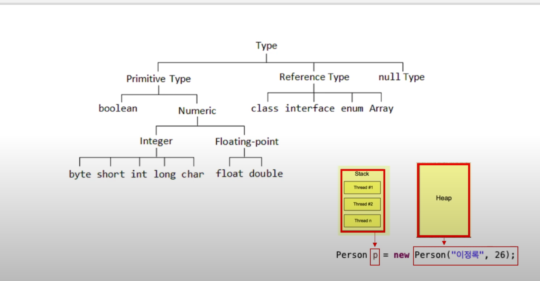 - 참조형(class, interface, enum, Array 등) 자료형도 같이 저장됩니다.