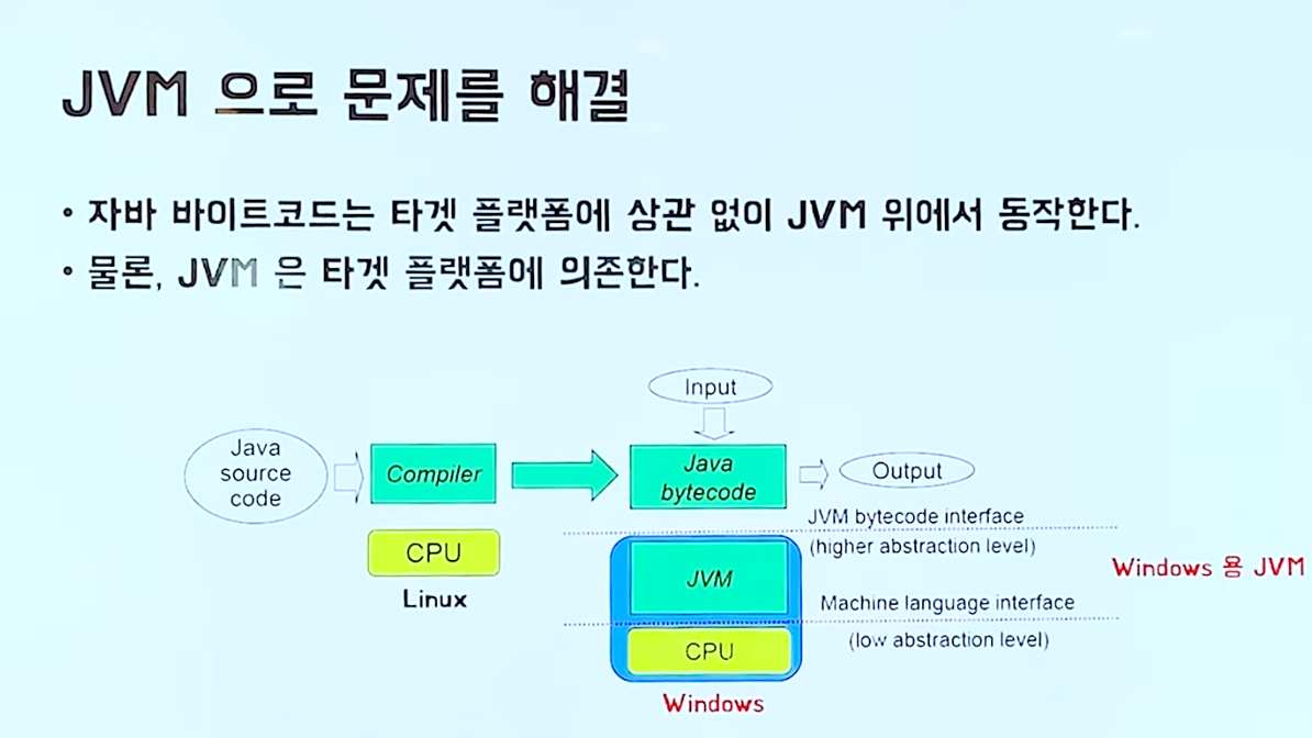 JVM은 자바 가상 머신으로, 자바 바이트 코드를 해석하고 실행하는 역할을 합니다. 자바 코드는 JVM을 통해 실행되므로 Window, Linux와 같은 다른 OS에서도 동일하게 실행할 수 있다는 장점이 있습니다.